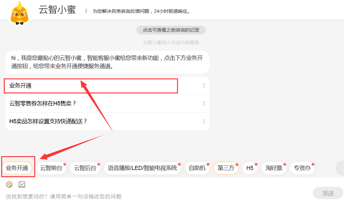 进入云智小蜜咨询界面后点击【业务开通】按钮即可找到相应开通链接,如有疑问,请及时联系我司客服咨询。