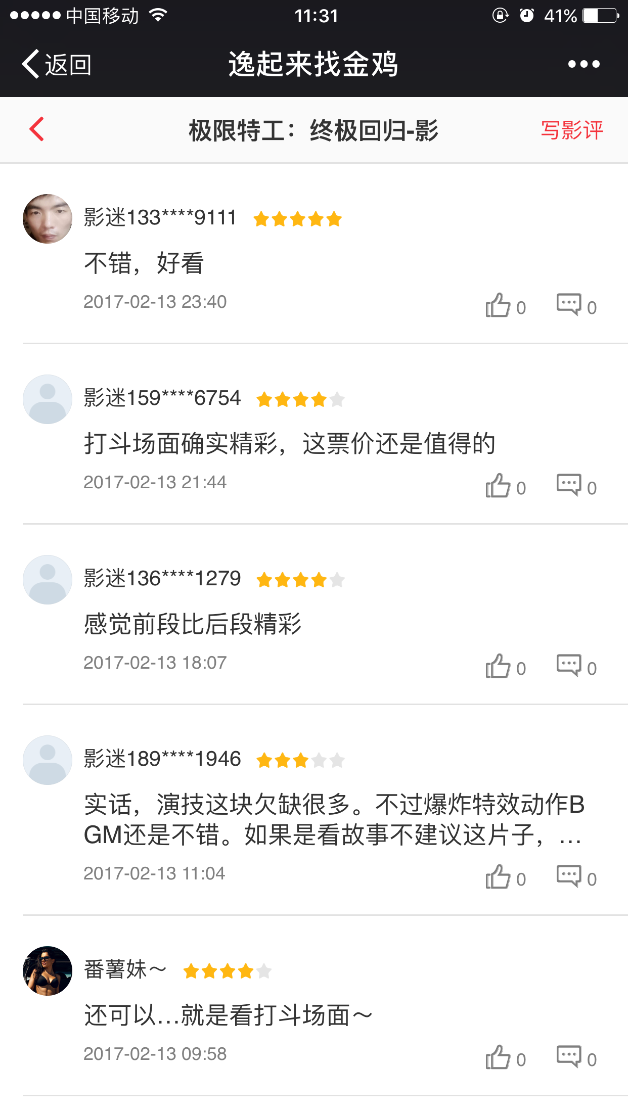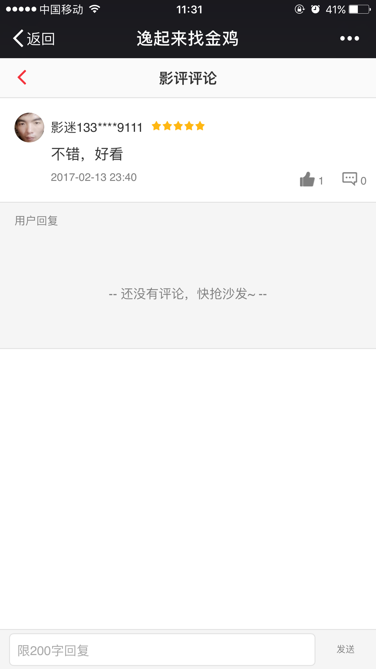 买票后的用户可以进行发送影评并获得积分,提供点赞及子评论功能。