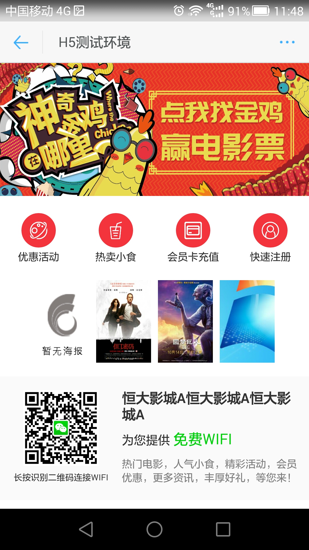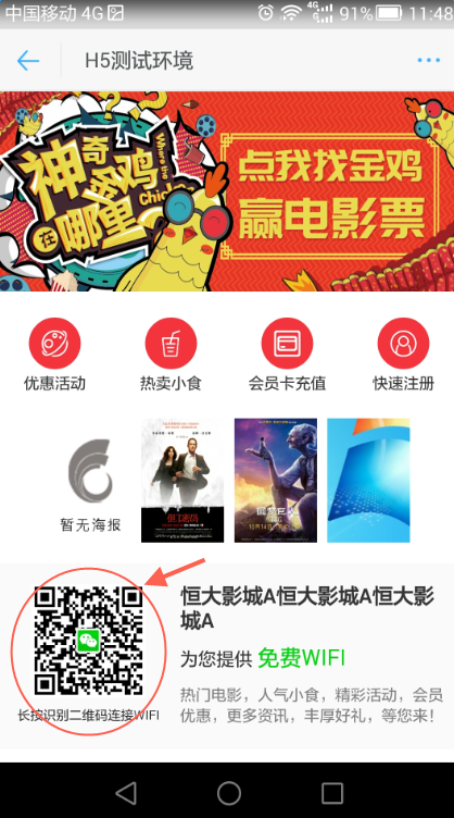 5、顾客连接上WIFI后,点击完成按钮可以进入影院配置的商家主页(设置可参考:商家主页管理)