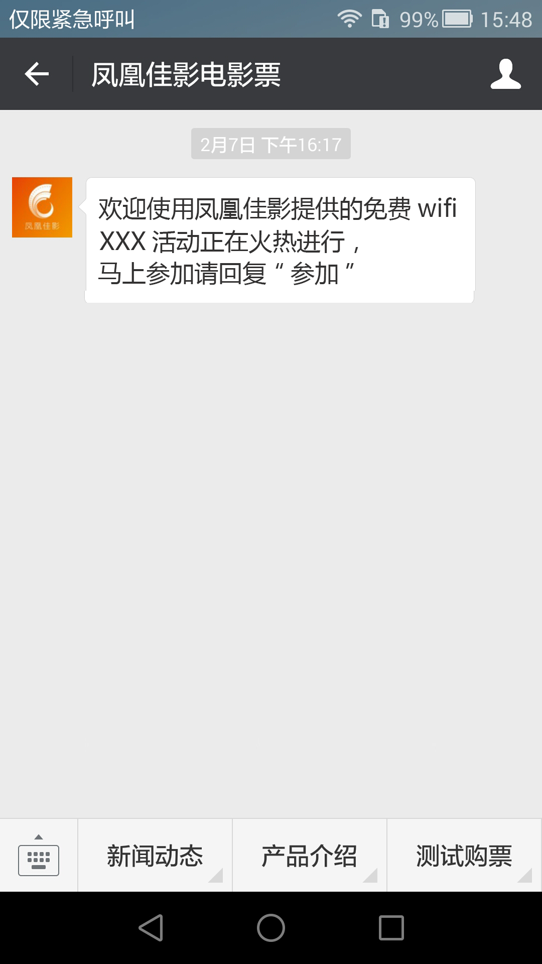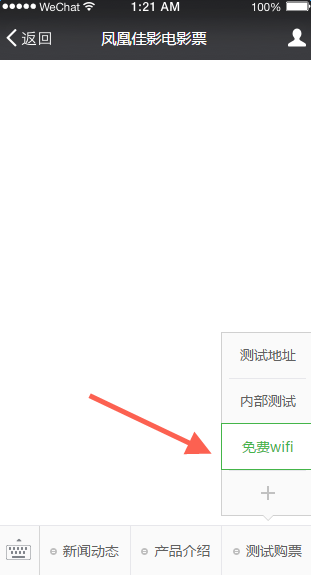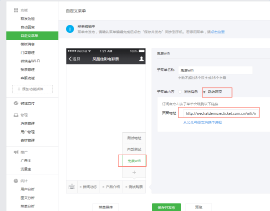 影院在公众平台上配置“免费WIFI”的自定义菜单,菜单连接即是粤科提供给影院的URL: