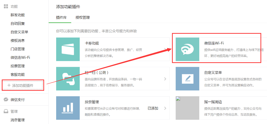 1、添加插件功能功,选择“微信连Wi-Fi”