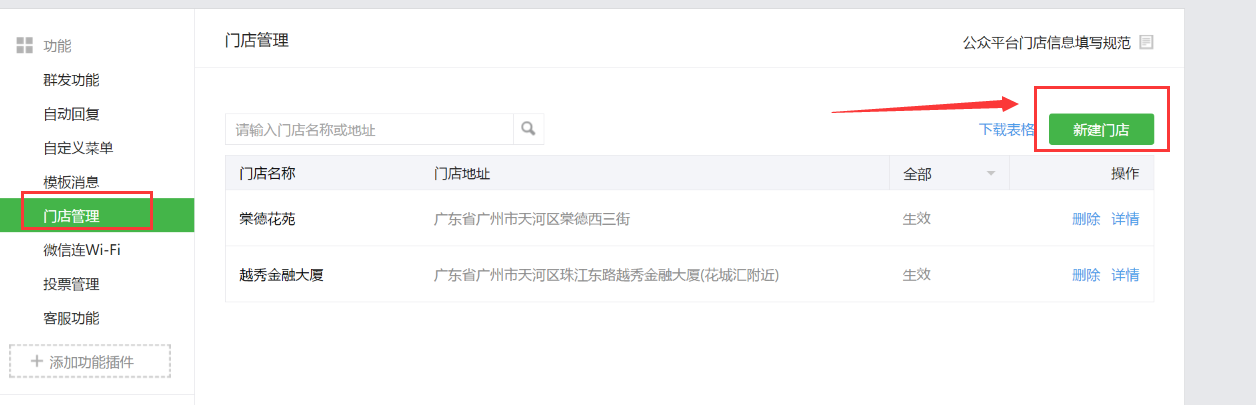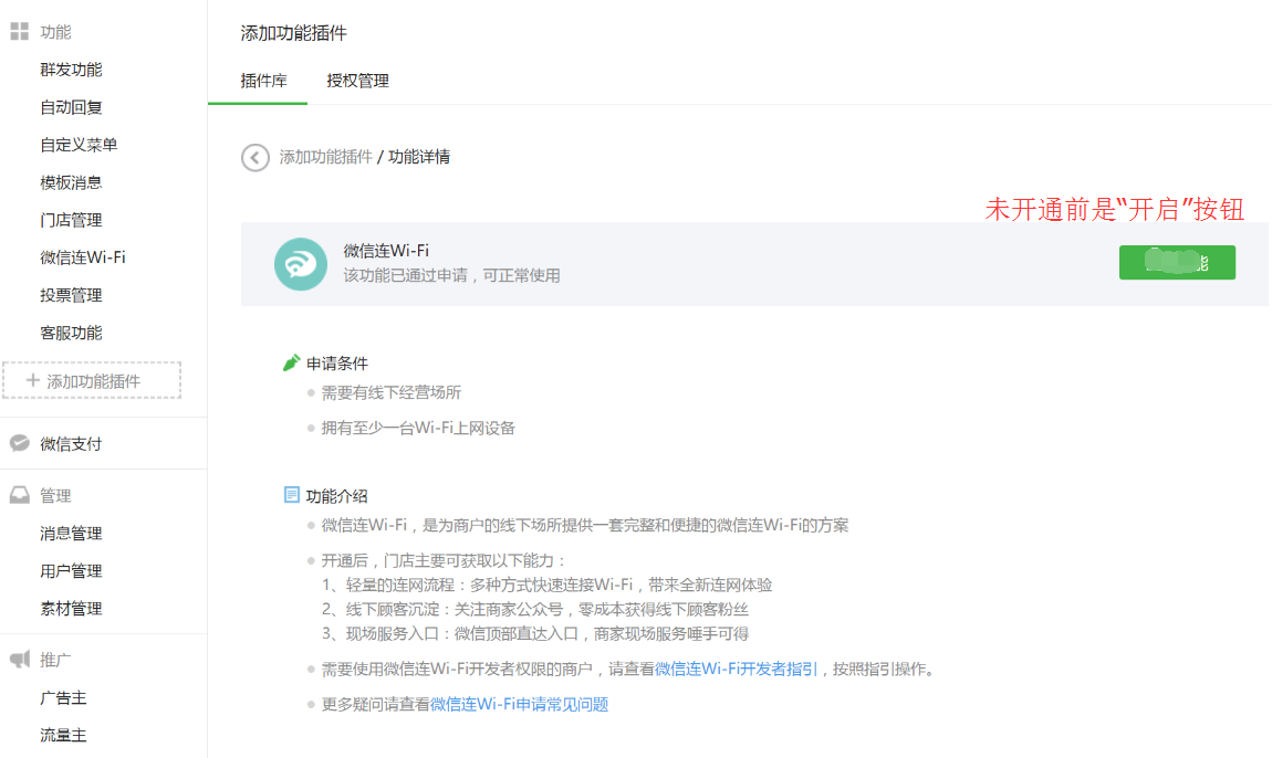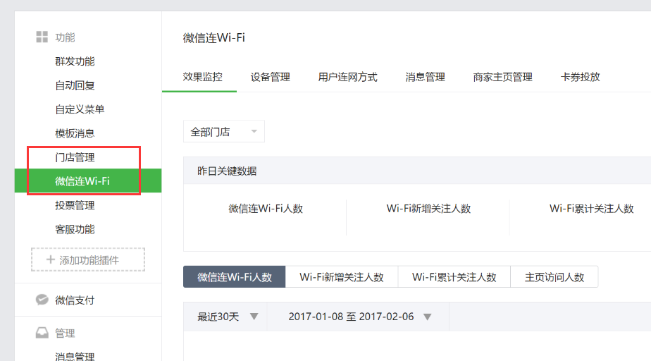 2、添加插件后,会增加了两个功能模块:“门店管理”和“微信连Wi-Fi”