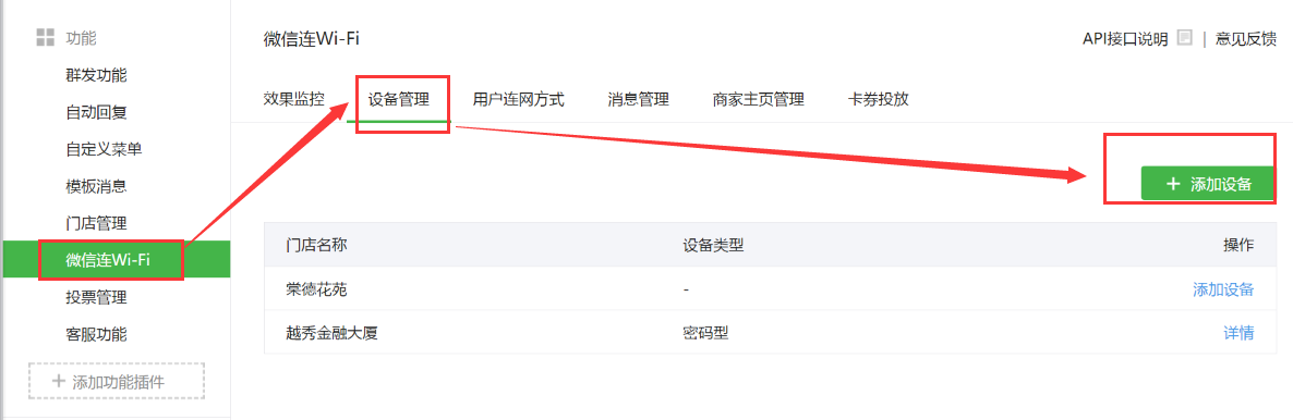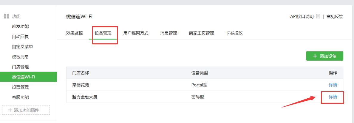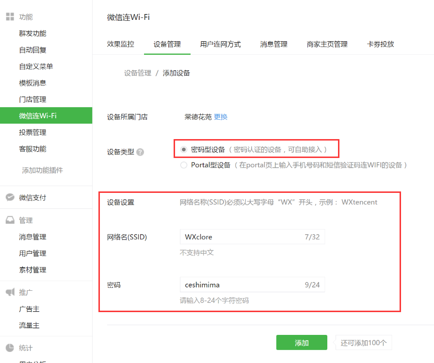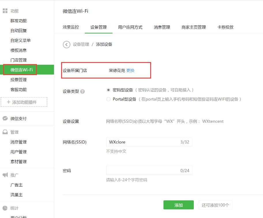 在微信连Wi-Fi的“设备管理”中,为各家门店添加对应的wifi设备信息