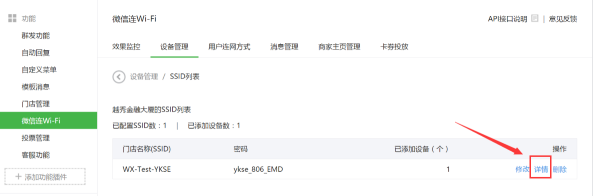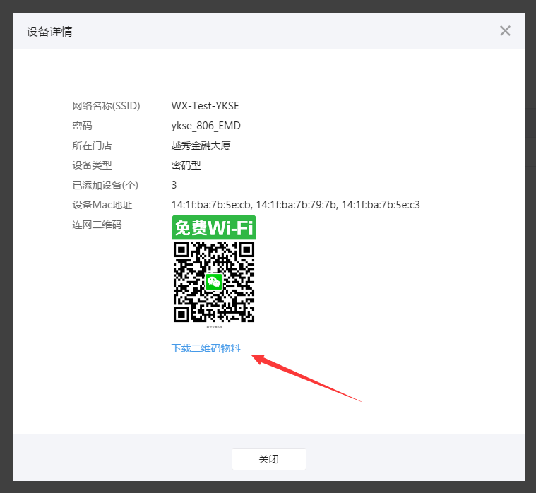 在微信连Wi-Fi的“设备管理”中,查看门店设备详情,下载二维码: