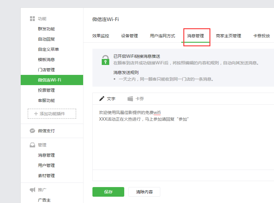 4、顾客连接上WIFI后,公众号可下发消息(设置可参考:消息管理)