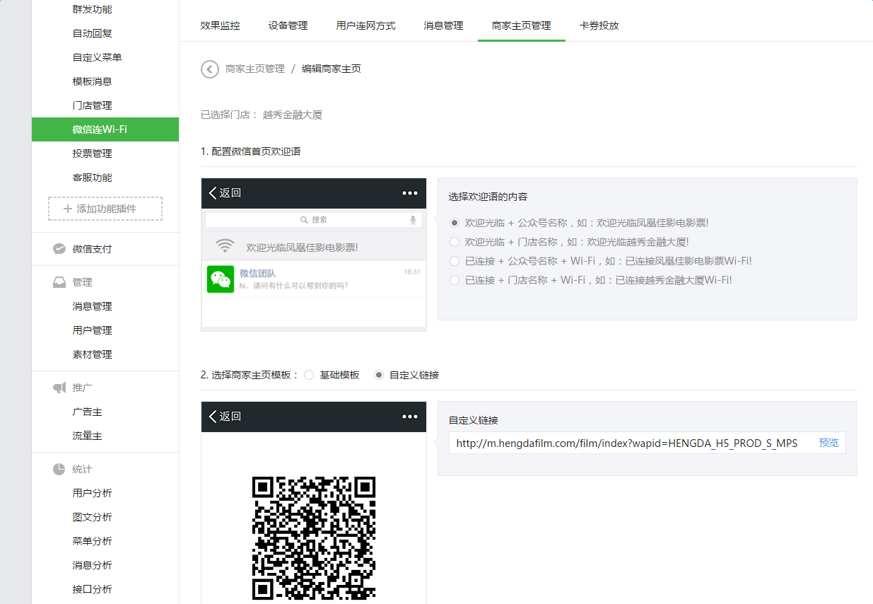 5、影院拿到URL后,在公众平台上进行配置并推广(可参考:H5微信连WIFI配置与推广)